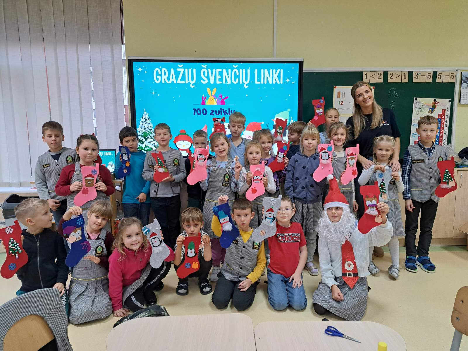 Lapkričio 26 dieną 1b klasėje svečiavosi vaikų edukacijų centras „100 zuikių“. Pirmokės Tėjos Zulonaitės mama Justina vedė pirmokams edukaciją ir priminė mokiniams, kad artėja ilgai laukta šventė – šv. Kalėdos! Edukacijos „Kalėdinės kojinės istorija“ metu mokiniai ne tik sužinojo apie Kalėdinių švenčių tradicijas, Kalėdų šventės prasmę, bet ir patys gamino kojinaites, kurias užbūrė savonorais ir svajonėmis. Dabar klasę puošia spalvingas kalendorius.